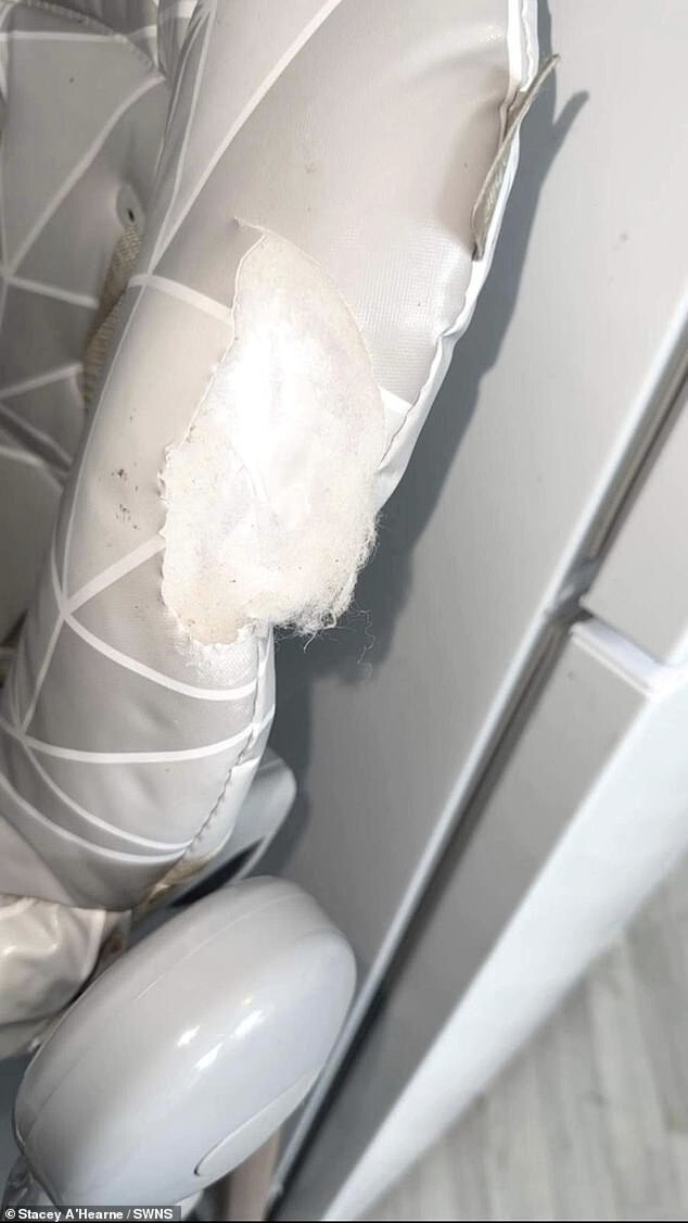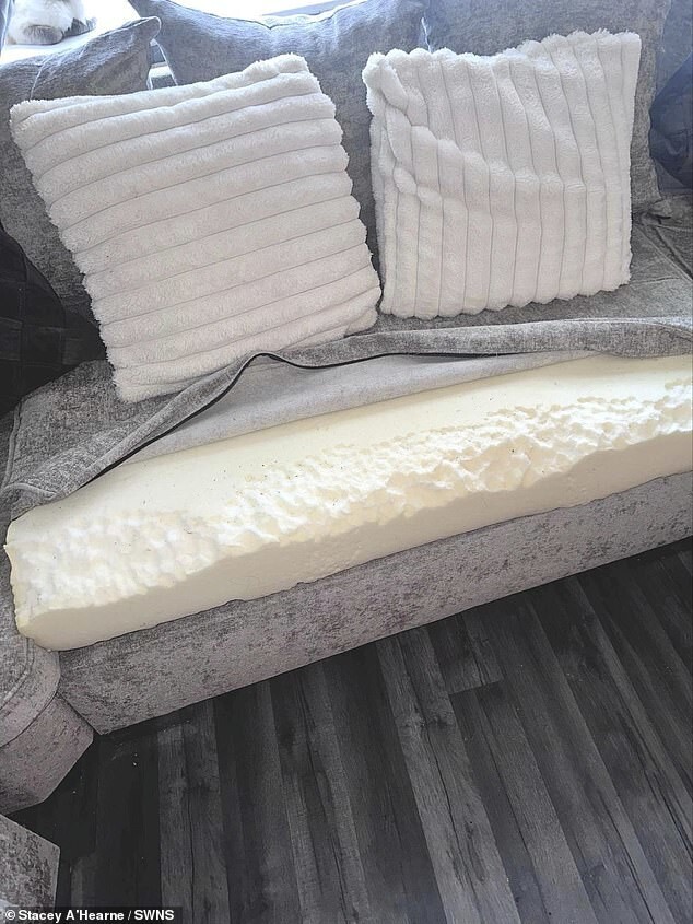 “She's literally eating our house,” Stacy says. “I bought a new sofa, and she tore pieces out of it.” She's very picky about regular food, but she can sit down and eat a dish sponge."