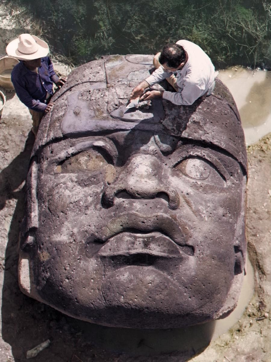 Large basalt head excavated in 1946 in Mexico