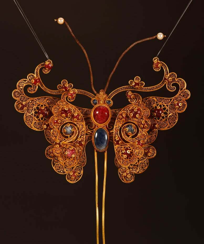 Butterfly clip made of gold wire, rubies, sapphires and two pearls, China, Ming Dynasty, 1368-1644
