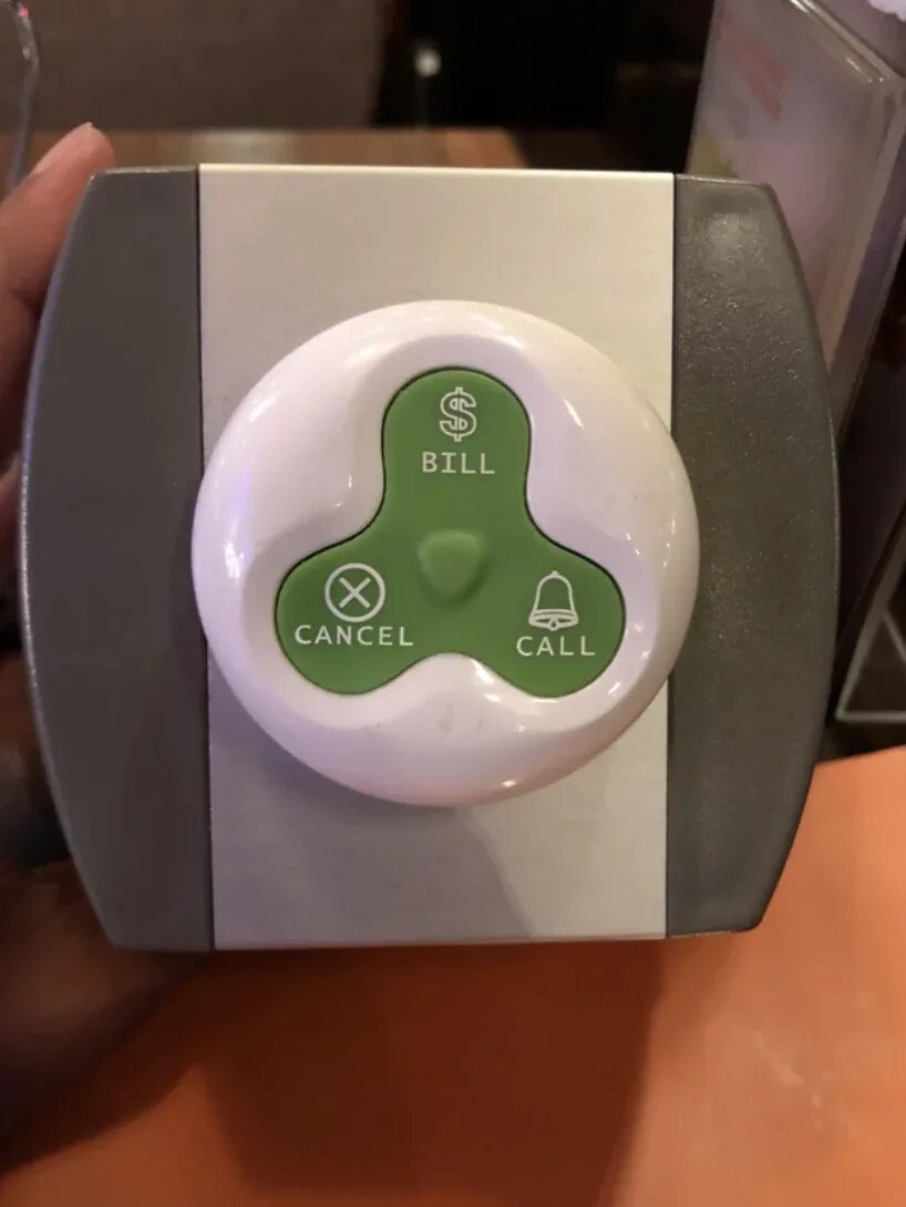 25. A button on a table in a restaurant with which you can ask for the bill, call a waiter, or cancel the request