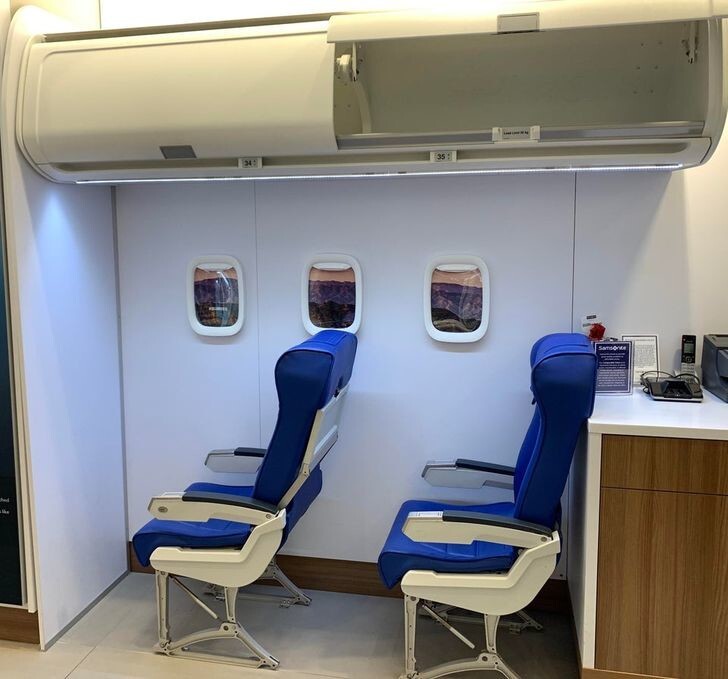 26. A suitcase store has a mini airplane model where customers can check to see if the bag fits on the overhead rack.