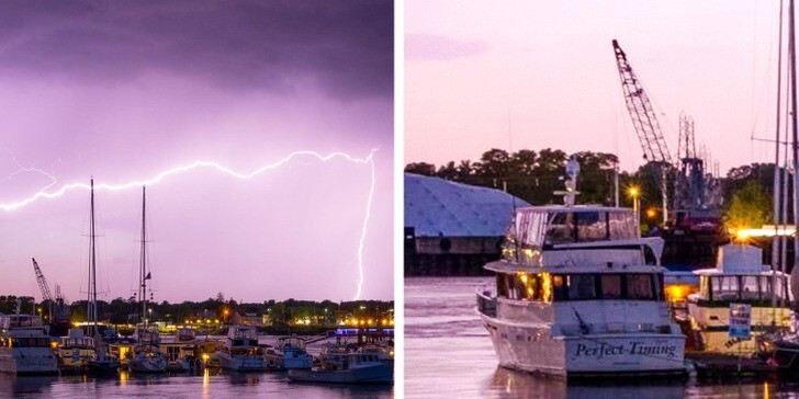 1. “My brother has been trying to photograph a lightning strike for a year. Yesterday he succeeded, and I just now noticed the name of the boat in the lower left corner [“Just in Time”].”