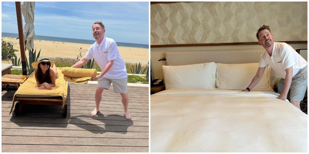 Macaulay Culkin, star of the film “Home Alone,” again surprised fans with his outburst. The 43-year-old actor decided to play a joke on his fiancee and bought a T-shirt with the hotel logo. After that, he waited on his girlfriend, bringing drinks, towels, making the bed and carrying luggage.