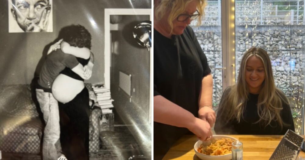 My mother gives birth to my older sister at the age of 26. The older sister waits for her mother to grate cheese into her spaghetti.