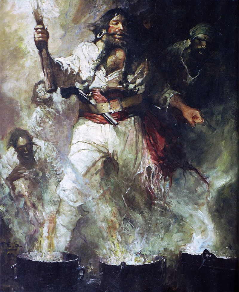 The image of Edward Teach in the painting “Blackbeard in Smoke and Fire” by artist Frank Schoonover