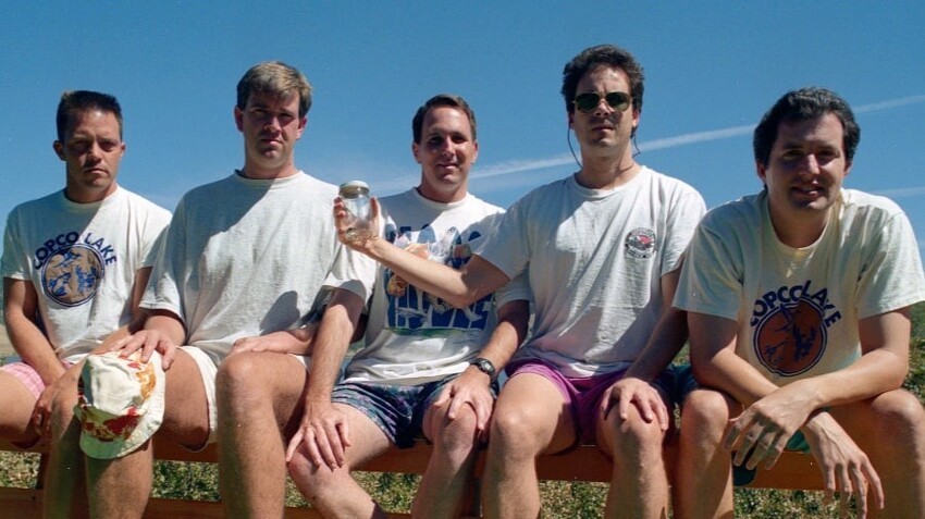 The frequency of guys reuniting by the lake for a photo is every 5 years!