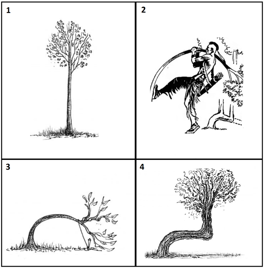 A living seedling was selected, the width of a thumb in diameter and approximately 2-3 meters high. This tree was bent and pointed in the desired direction, and then fixed in this position with strips of animal skins, bark or vines, depending on the materials to which the Indian had access.