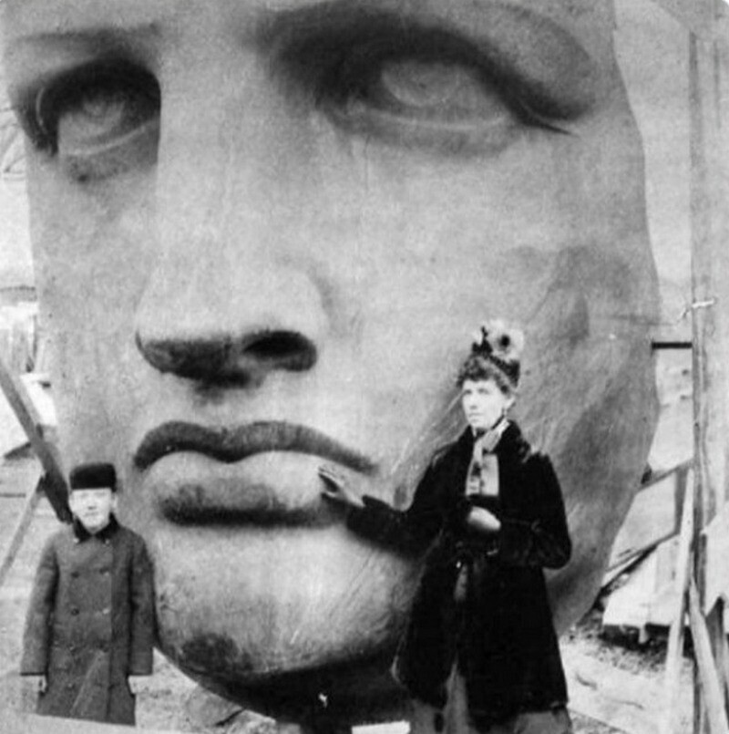 Photo taken during the unpacking of the head of the Statue of Liberty, 1885.