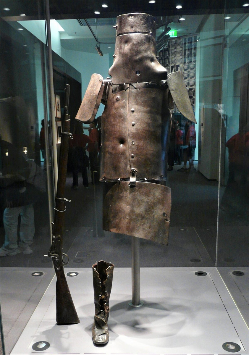 But the most effective suit was Ned's. It was made of 6 mm thick iron. The armor included a long breast plate, shoulder pads, shields, an apron and a helmet. The helmet resembled a tin can without a top. It had a long slit for the eyes. The helmet was secured with leather straps.