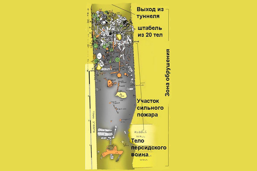 Here, in a dark corridor 1.7 m high and less than 1.5 m wide, a fierce battle took place. The discovered particles of sulfur, straw and torches indicated that at some point the Persians went all-in.