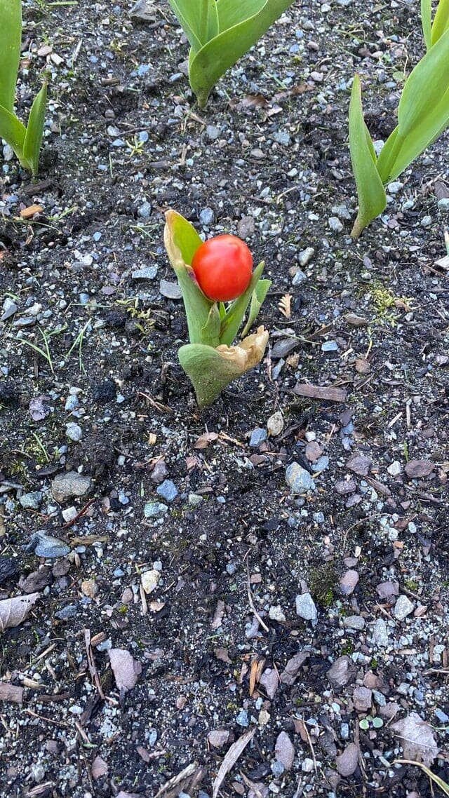 9. My brother broke a tulip and tried to hide it with a tomato.