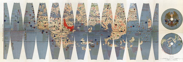Martin Beheim constructed the globe "Earth Apple" (German: Erdapfel) in Germany in 1492. This is the oldest globe that has survived to this day. He depicts the world as spherical and the unknown America as an empty ocean.