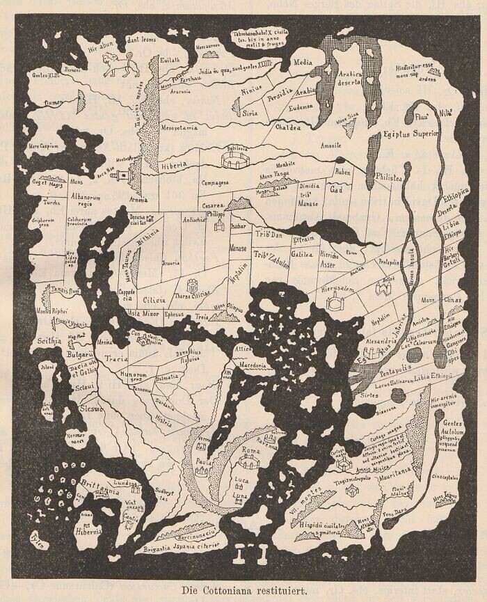 The Anglo-Saxon Cotton Map was created between 1025 and 1050 AD. The highest area of this map consists of the eastern regions of the earth. Misinterpreting descriptions of the Red Sea, the artist mistakenly colored every river in Africa red.