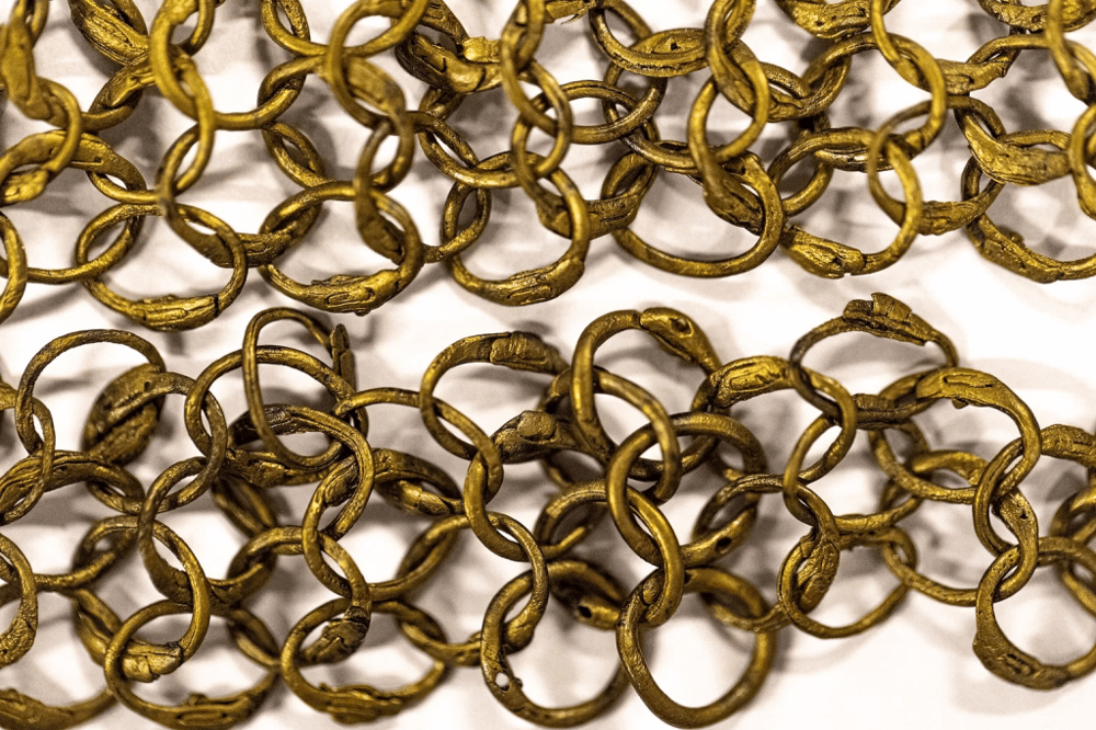Decorative border of riveted brass rings for a chain mail (hauberk) analyzed in connection with diving. Chain mail of this quality could consist of 150,000 rings. Photo: Rolf Warming