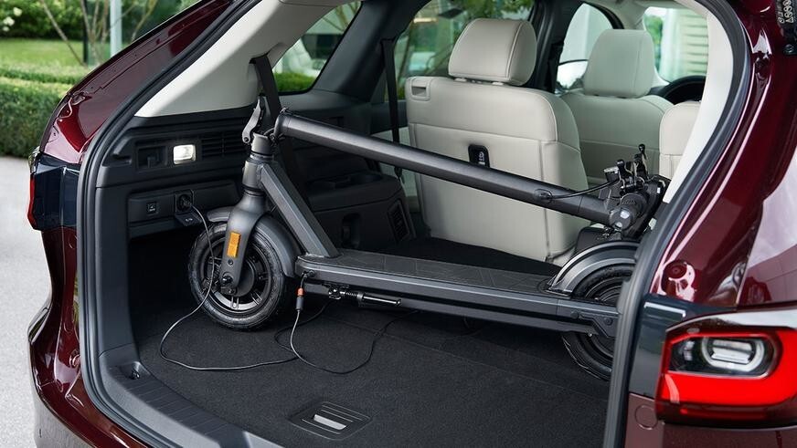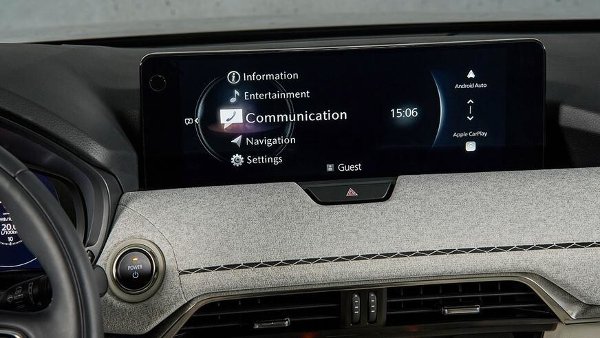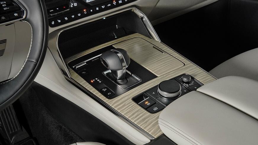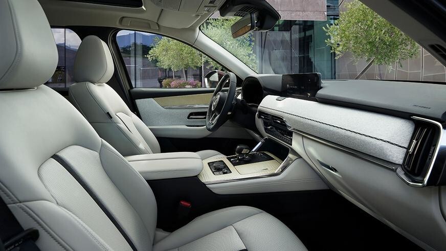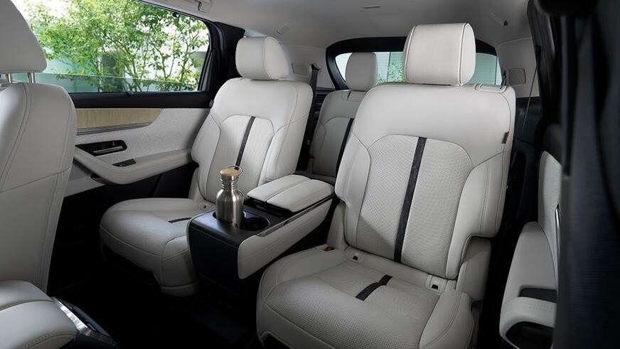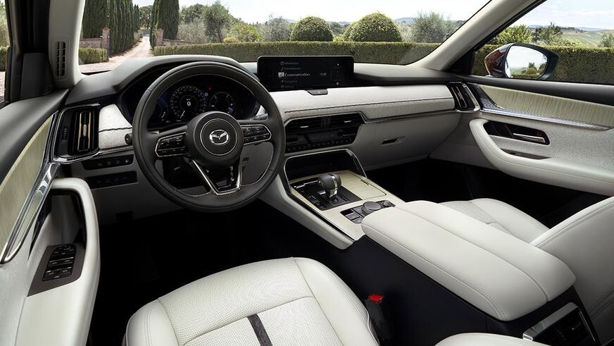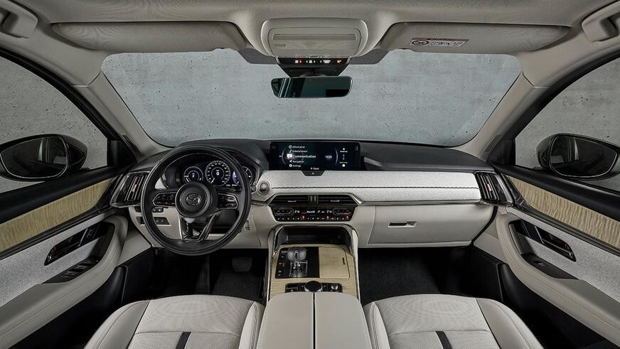 The driver's area of the interior is directly carried over from the CX-60. The crossover has the same front panel with an original finish, central tunnel, steering wheel and 12.3-inch screen. The first to go on sale will be a 6-seater version with separate seats on the second row, to which it will be possible to optionally add a console with a box for small items and cup holders. She will also play the role of an armrest. The seats of the second move longitudinally in the range of 120 mm.