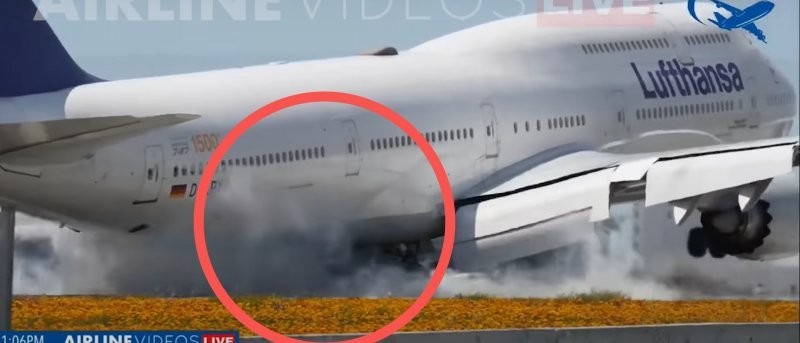 The aircraft, operating flight 456 Frankfurt - Los Angeles, was landing normally until its wheels touched the ground. A cloud of white smoke burst out from under the landing gear and the plane jerked upward.