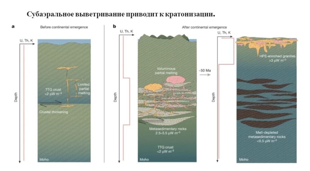 As a result of weathering, fuel-releasing elements were concentrated in the shallow crust: uranium, thorium, potassium. This allowed the deeper crust to cool and harden. This created a thick, hard layer that protected the bottoms of the continents from deformation.