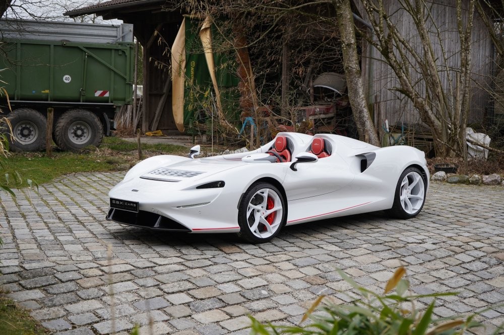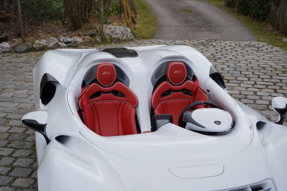 Thin red stripes on the body and brake calipers of the same color behind white forged wheels echo the red leather on the seats, which are almost always visible. The design feature of Elva is the complete absence of a roof and windshield.