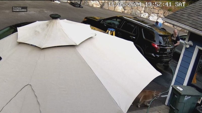 “My cat is walking, all in his business,” Greg comments on the footage. “A puma runs out of the forest, rushes across the yard and ends up among us.”