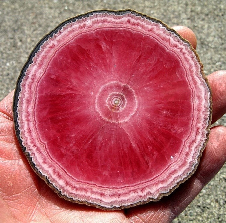13. Rhodochrosite is commonly found in stalactites in caves in Argentina. It has rings like a tree