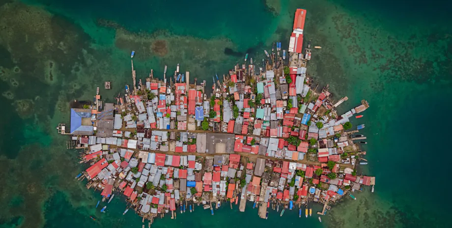 Gardi Sugdub is one of the 50 inhabited islands in the Guna Yala archipelago. It is only 400 yards (366 meters) long and 150 yards (137 meters) wide. The Caribbean island protrudes above the water by only 40 centimeters. Every year, especially in November and December, when strong winds disperse the waves, water floods the streets and enters houses.