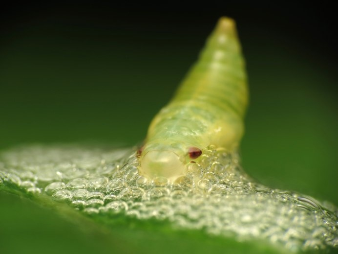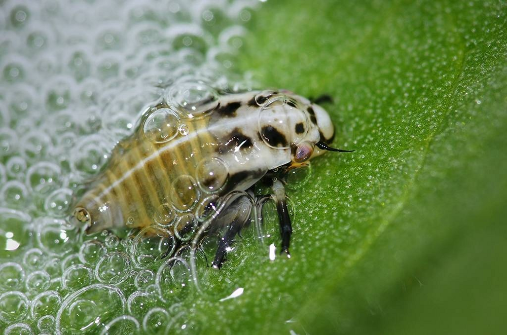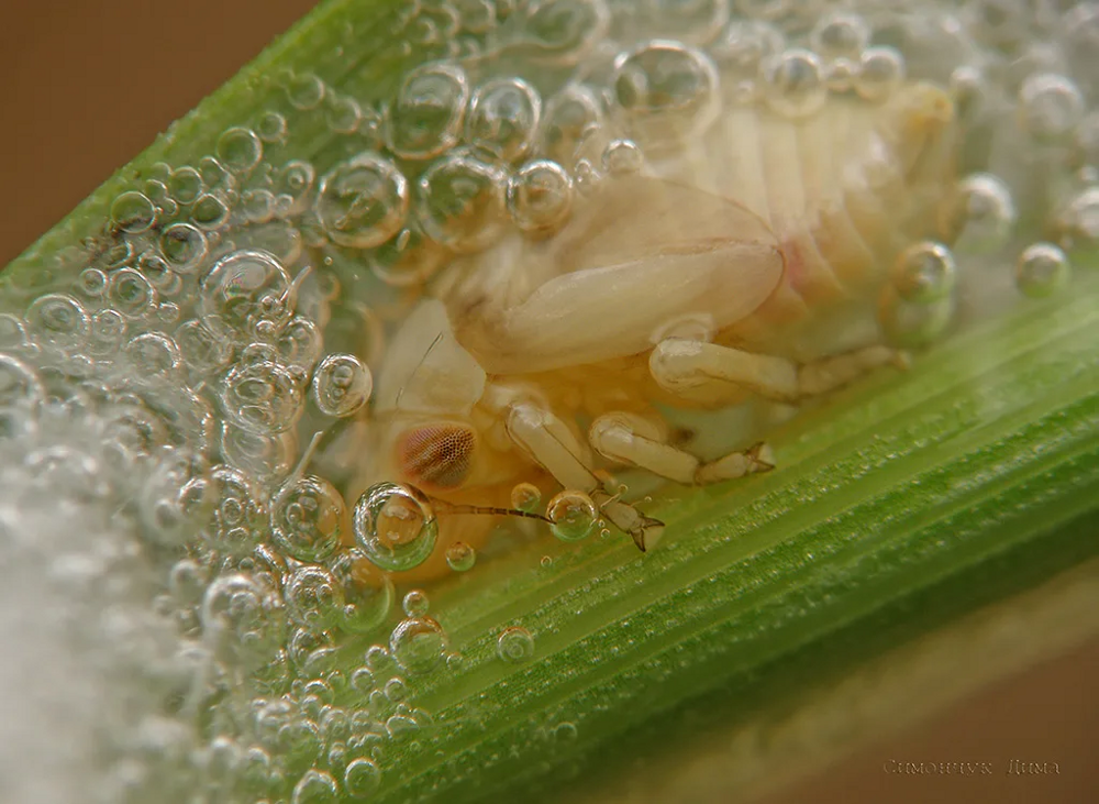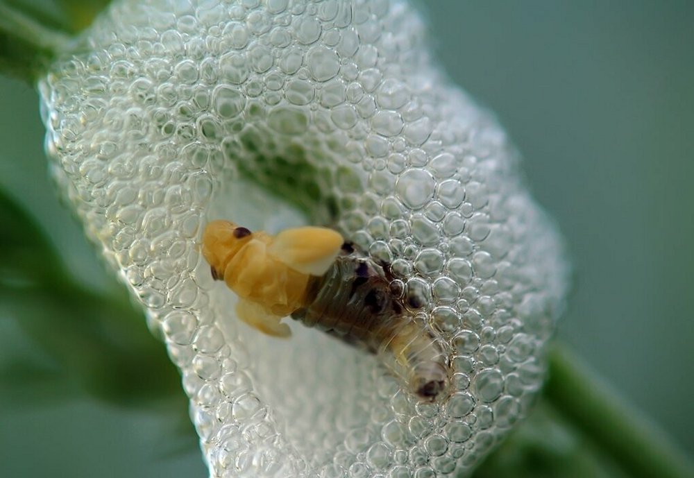 Cicada larvae are even smaller than their parents - 3-5 mm. But the appetite of growing organisms is not sickly. The baby sits on the stems, looking for the sweetest corner. And as soon as he finds it, he grabs onto it and won’t let go. For 50 days, the larva draws all the juices from the plant. And at the same time it releases that very liquid.