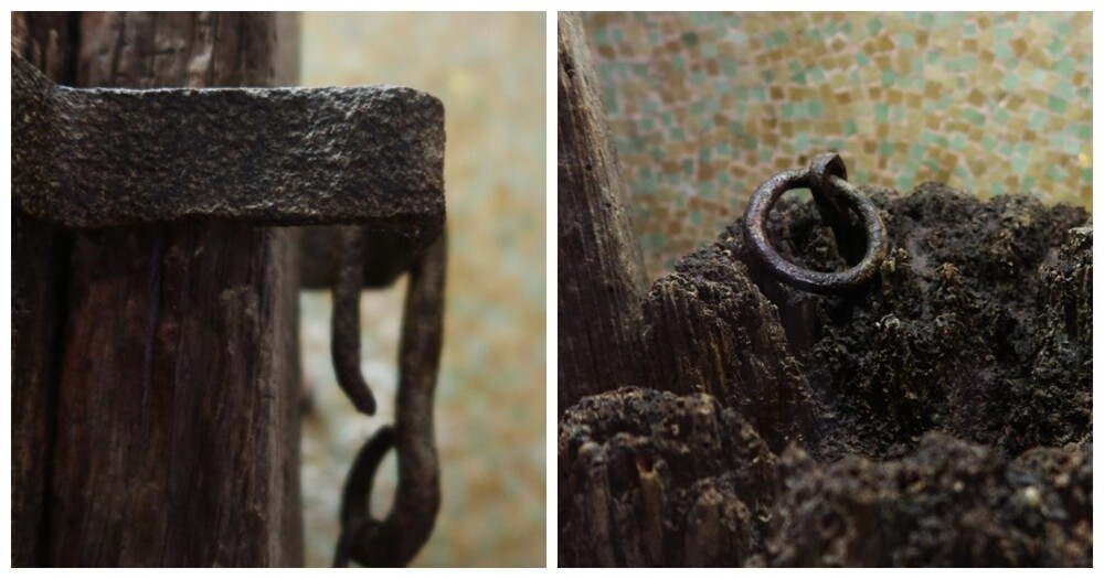 But, of course, this is a tool designed for decapitation. The blade is secured under a heavy log, which is held above the condemned person's head using two metal rings. When the log was released, under its weight the blade slid along the guides, and the blow decapitated the condemned man.