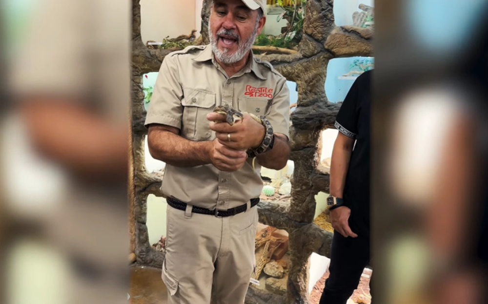 In the published footage, you can see how a reptile with a genetic mutation bites a man with two heads at once. Brewer held the reptile above its neck and waved the index finger of his right hand in front of it, while his assistant watched the tail.