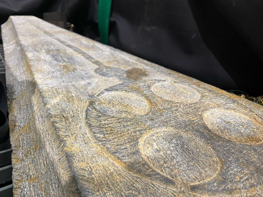 "One perfectly preserved slab measures 1.5 m in size and weighs approximately 70 kg. The other, larger one, consists of two parts, its total length is 2 m, and its weight is about 200 kg."