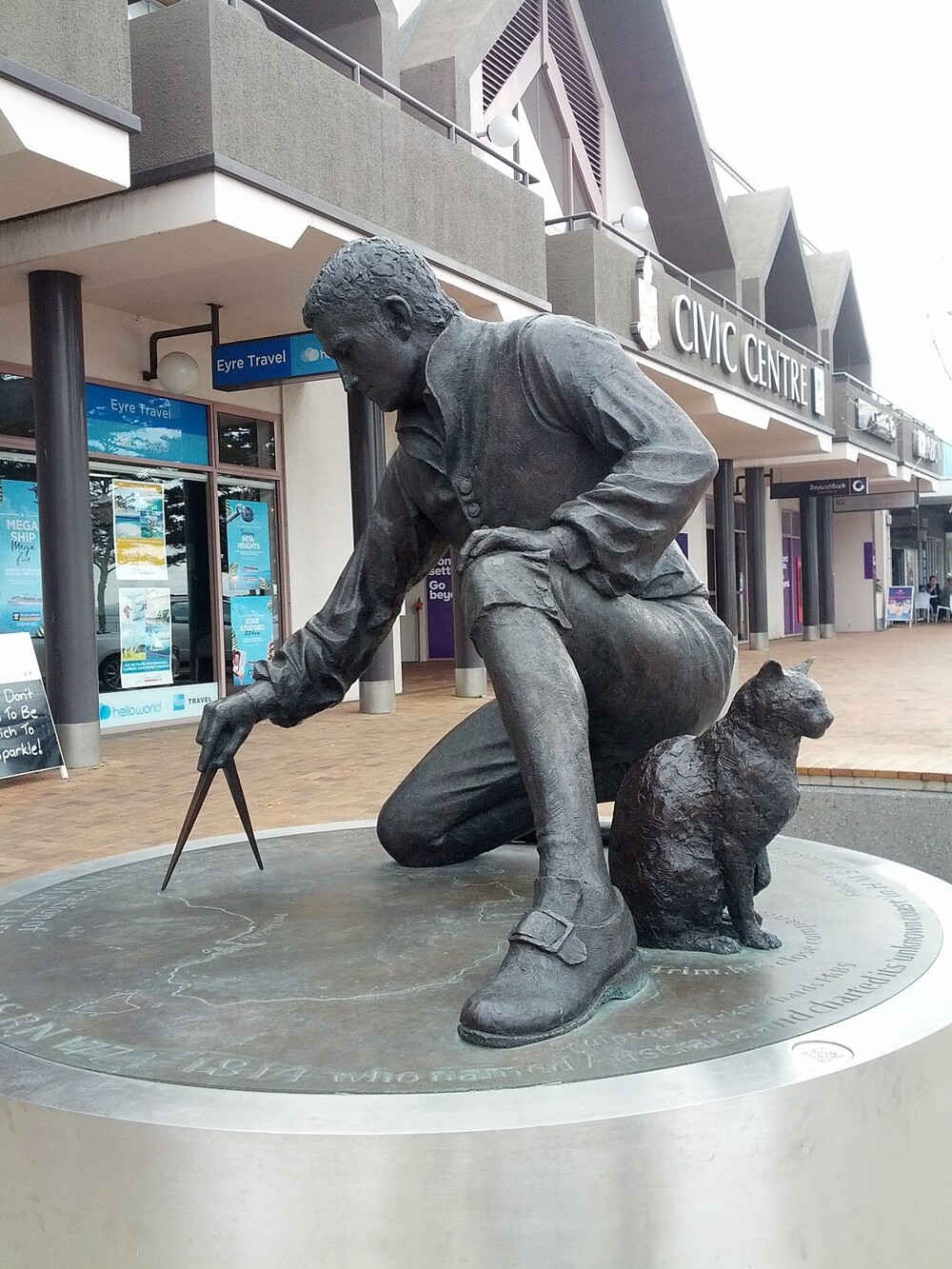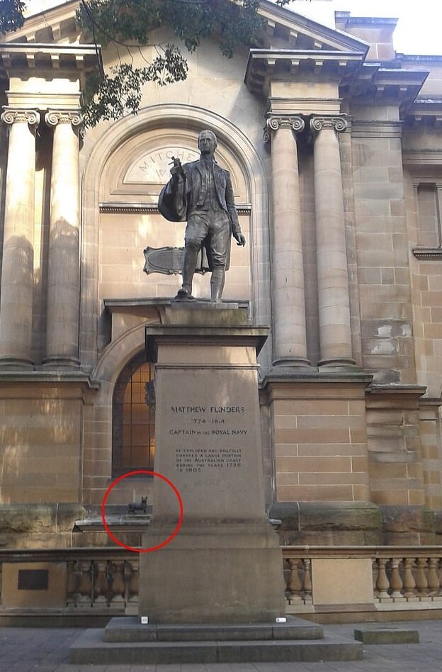 A statue of Matthew Flinders was erected outside the State Library of New South Wales in 1925. A small figurine of his cat Trim was placed behind Flinders on the windowsill in 1996