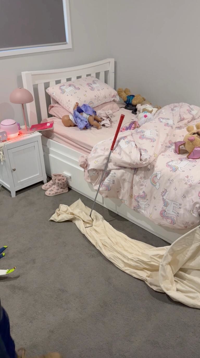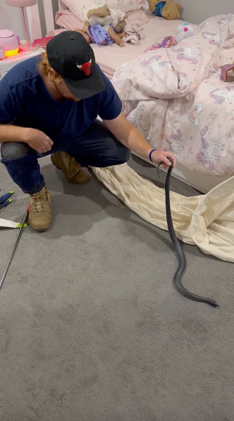 Footage released by Snake Catchers Brisbane & Gold Coast shows Bryce Lockett leaning over the bed, removing the stuffed animal and picking up the medium-sized snake by the tail.