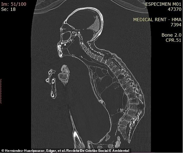 “Based on surface morphological and tomographic analysis, it is concluded that specimen M01 is a desiccated humanoid body with a biological architecture similar to that of a human.”