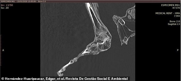 Compared to a normal human foot, Mary's calcaneus, which forms the heel, has a different shape and structure. Typically, human heel bones have a large bump at the back that helps support body weight and maintain balance when a person stands upright on two legs. However, Maria does not have this tubercle, which suggests that she walked hunched over to maintain stability.