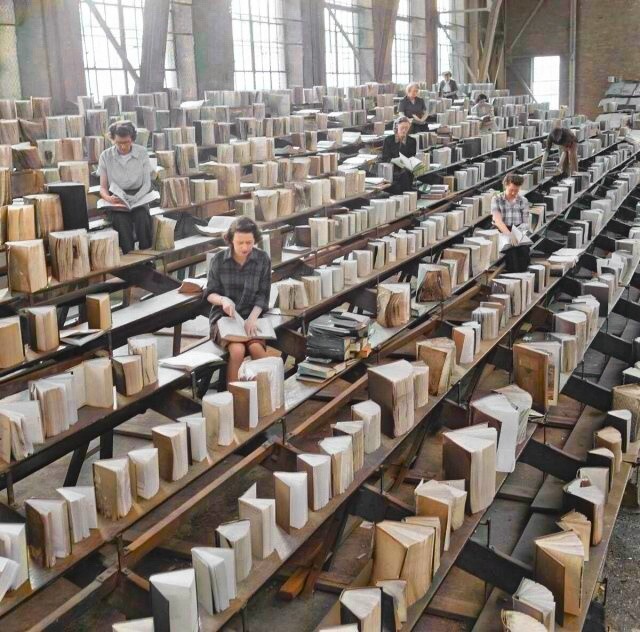 The library was flooded after a huge fire was extinguished in Lansing, Michigan. It took librarians a lot of time to dry the surviving books and documents.