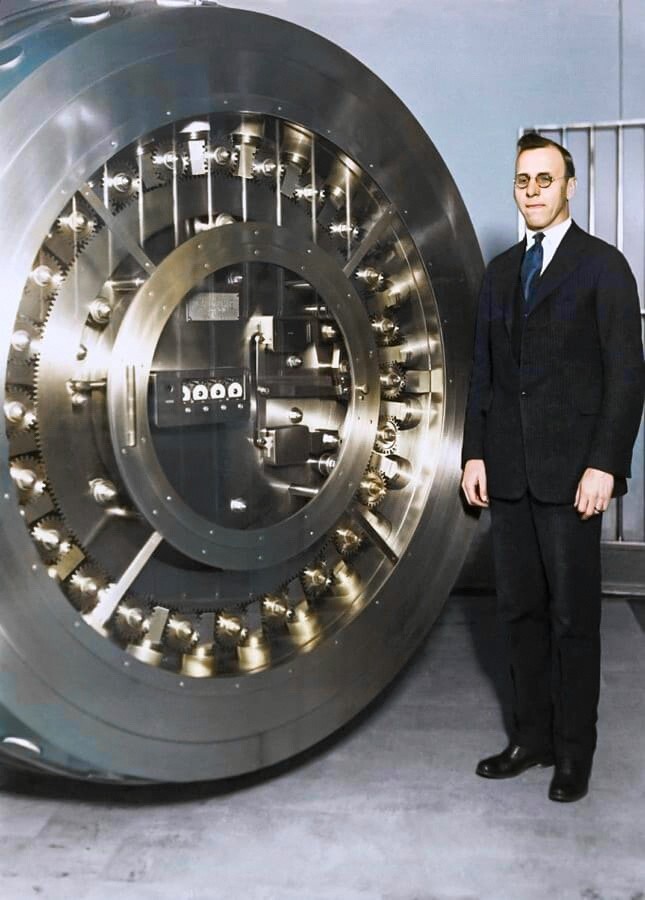 New National Bank vault door in Chicago that weighs 30 tons. Illinois, USA, 1923.