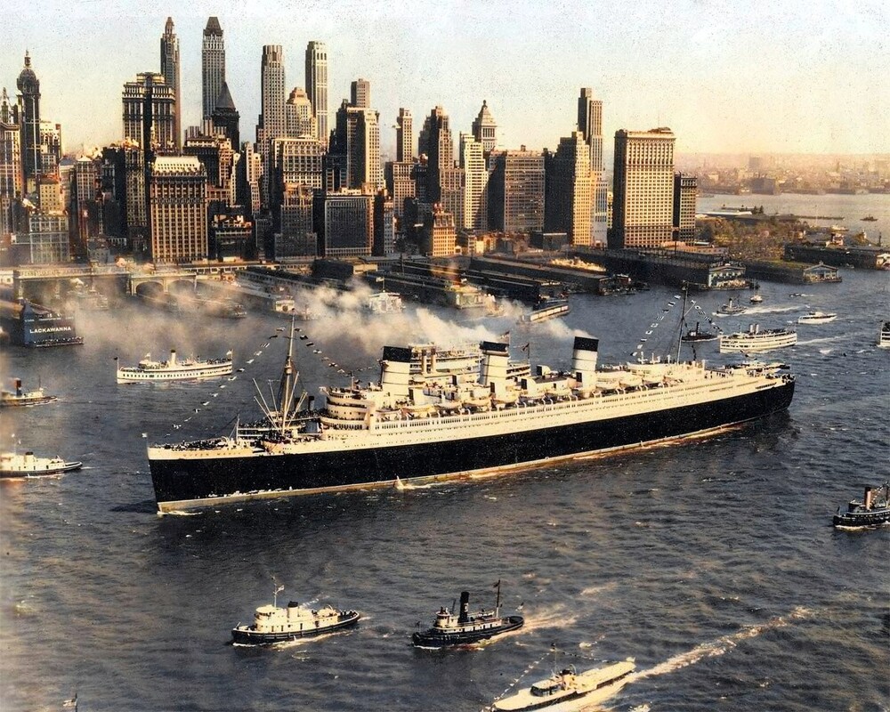 The picture shows the ocean liner Queen Mary, which was built in the first half of the thirties of the last century, at the height of the global economic crisis.