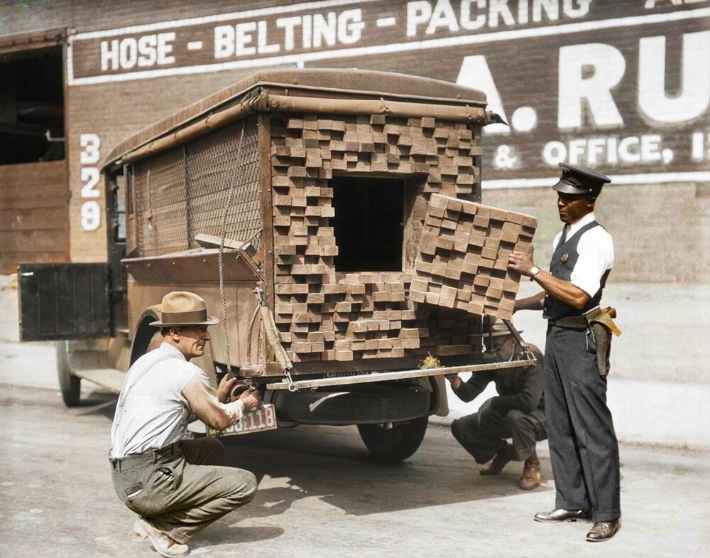 Federal agents search a liquor truck disguised as a lumber delivery truck.