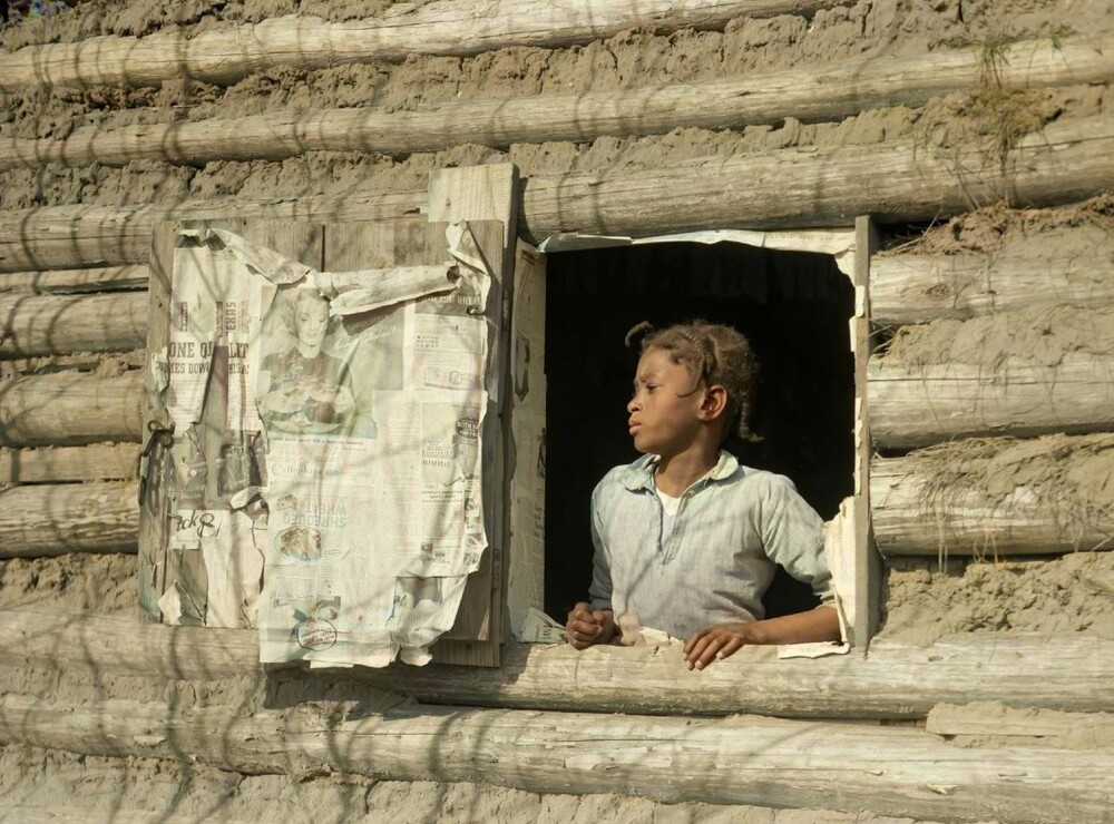 A girl looks out the window of her primitive cabin in Alabama, 1937.