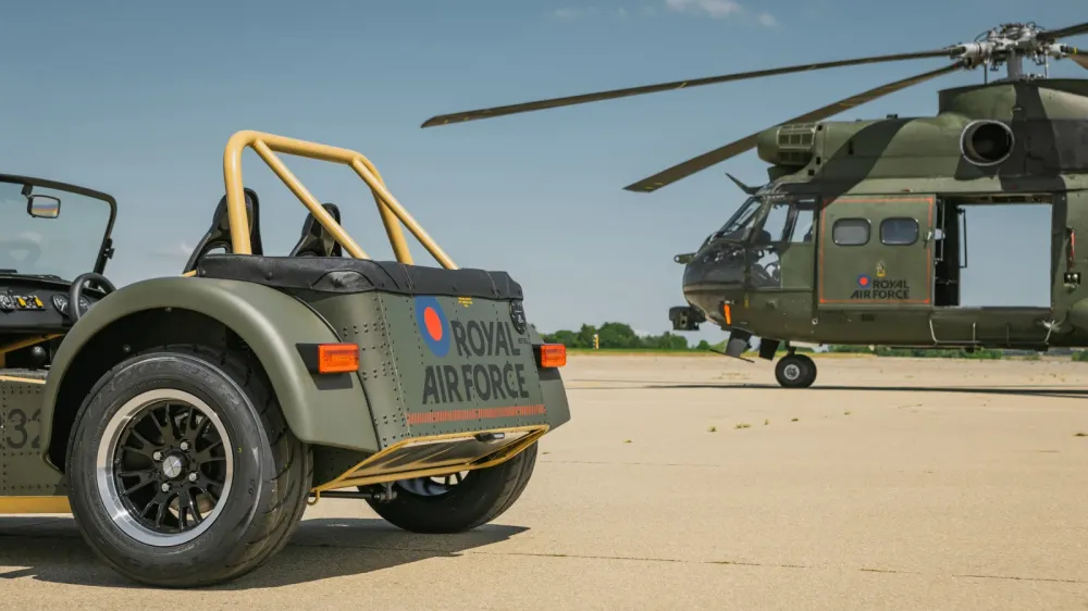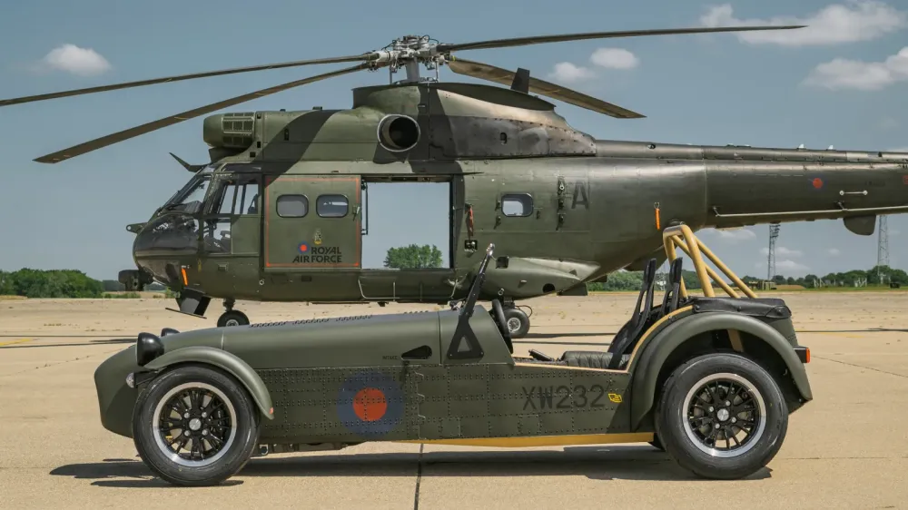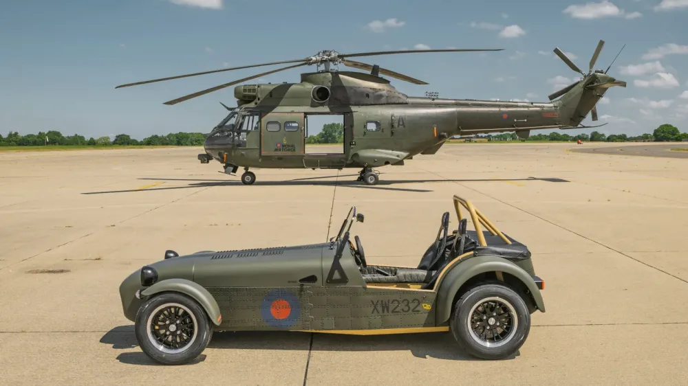 Caterham Cars has unveiled the unique RAF 360 Roadster, built in conjunction with the Royal Air Force (RAF) using upholstery, interior components and other parts from a decommissioned Puma HC2 military helicopter. The car was created for charitable purposes: it will be sold at auction, and the proceeds will be transferred to a fund to help military personnel.