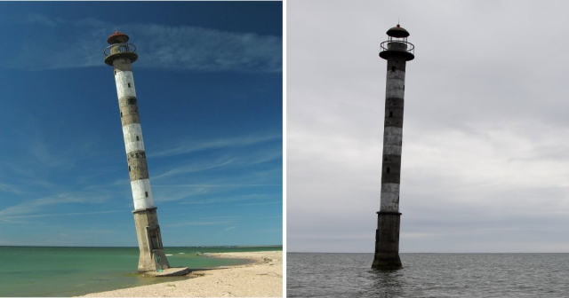 Built in 1933 on land, 100-150 meters from the shore, but over time it became surrounded by water and tilted. Currently officially abandoned.