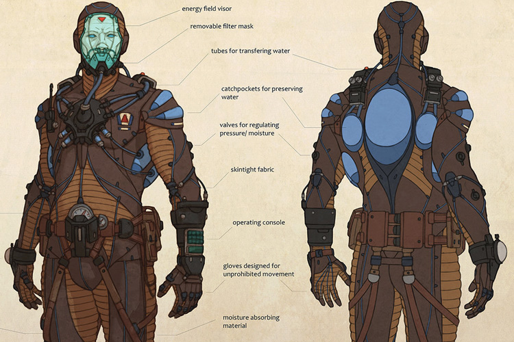 Inspired by the idea of collecting and preserving liquid created by the Zen Sunnis, the ancestors of the Fremen from the planet Dune, scientists developed similar spacesuits, only less beautiful. Since they had a hard time coming up with ideas for a name, the new spacesuit was called “Dune.”