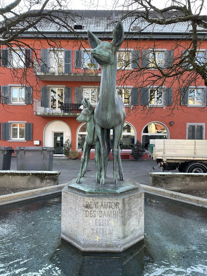 There are more than 1,200 fountains throughout Zurich, providing residents with clean drinking water. Each of them is a unique design of its kind. And some are monuments in honor of famous and famous citizens. This one is especially loved by locals and tourists, because it is dedicated to Bambi, a cute deer made famous by the Walt Disney film. And, of course, to the author himself.