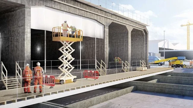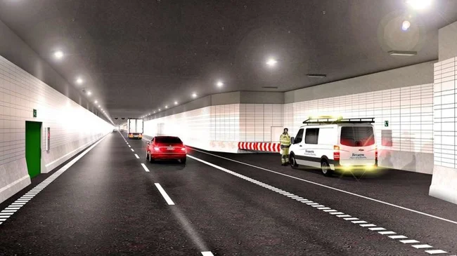 The tunnel is very wide, as it will consist of a pair of two-lane highways, separated by a service road, and two electrified railway tracks.