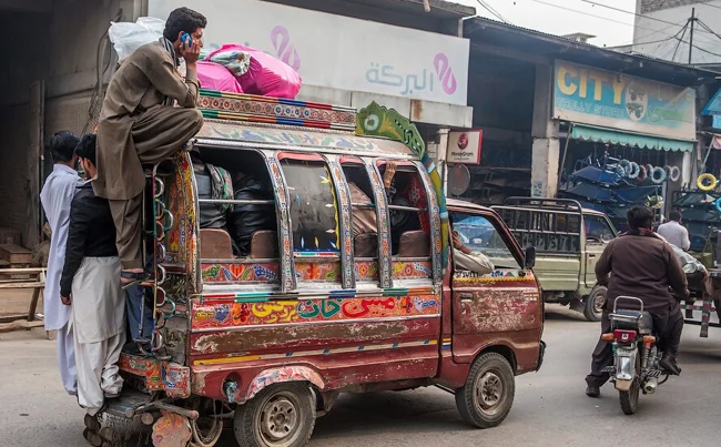 This is what the final destination of a minibus in Pakistan looks like. Hundreds of cars have gathered in a live queue, waiting to leave for the route.