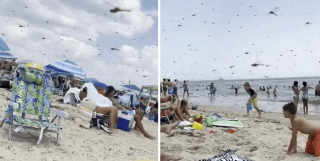 A black "cloud" of insects descended on the beach on Saturday, July 27, flying past terrified people who were running in panic. Witnesses described the noise as eerie.