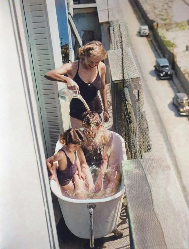 Bathing on the balcony. France, 1937.