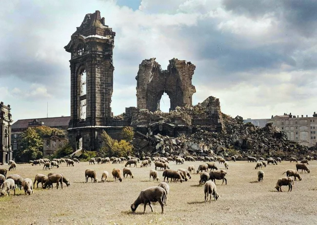 Sheep graze near the ruins of the Dresden "Church of Our Lady", Germany, 1957.