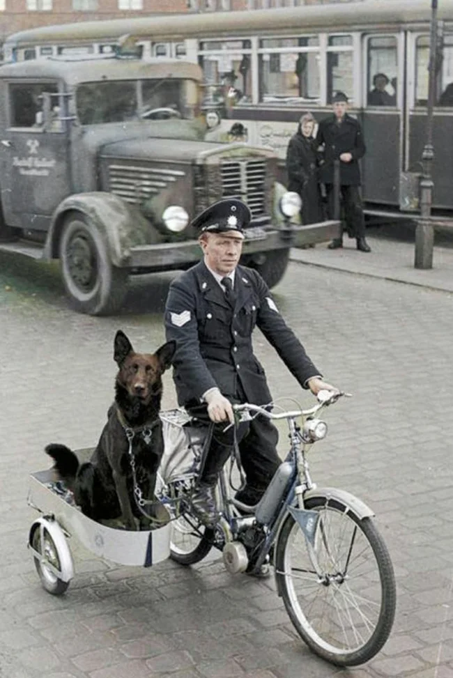 A policeman goes to work with his dog. Hamburg, 1955.