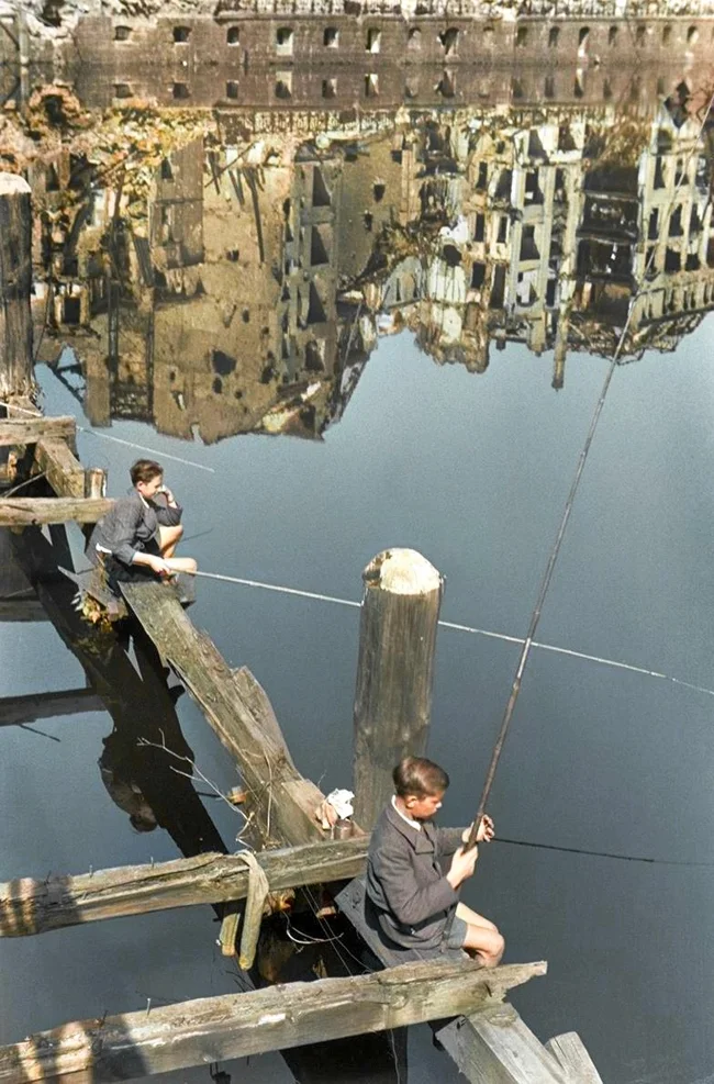 Teenagers fishing in war-torn Berlin, 1947.