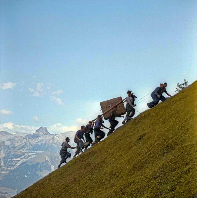 Animal rights activists carry an Alpine ibex, which will be released into the wild. Nidwalden, Switzerland, 1954.